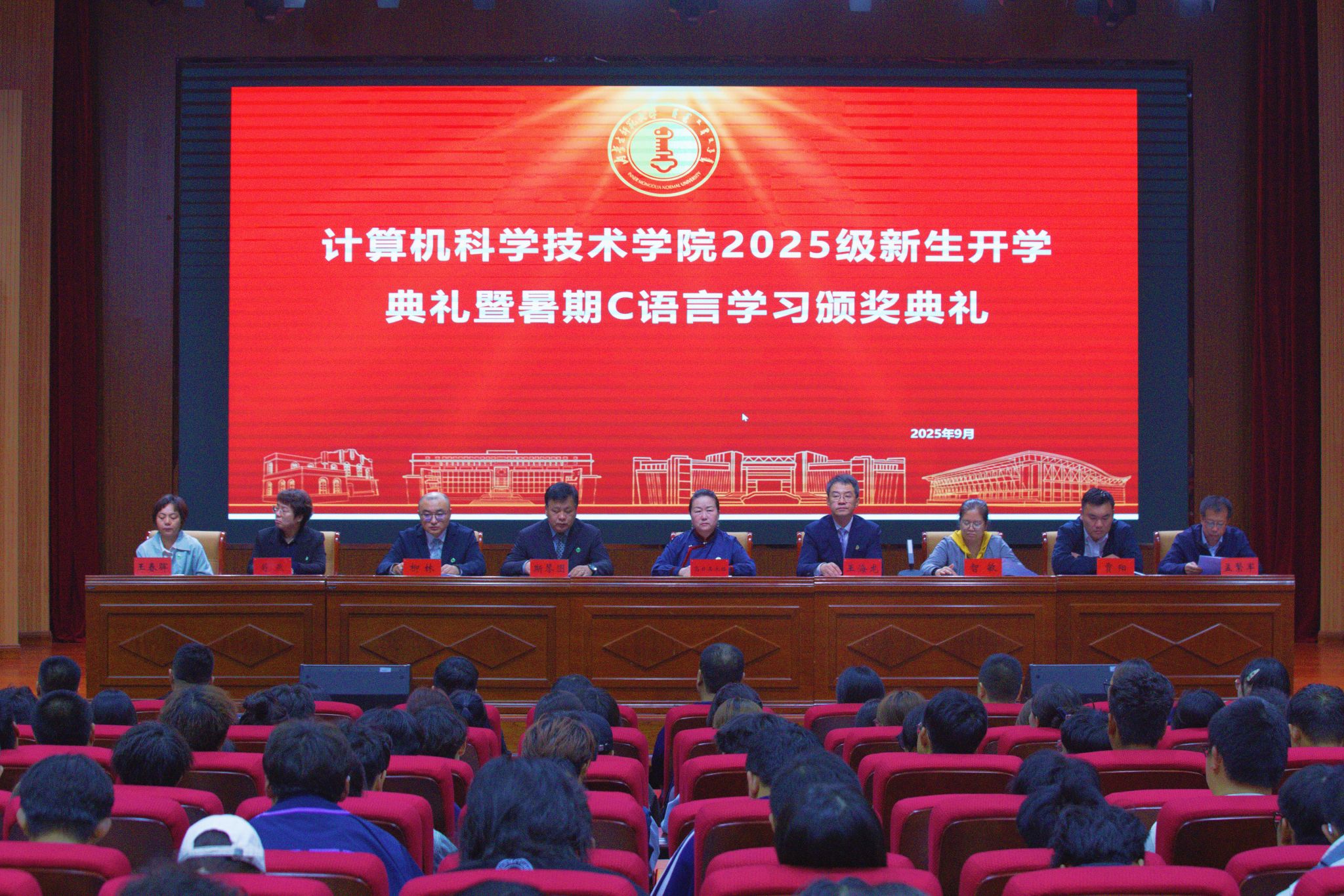 9月27日,太阳成集团tyc138举行2025级本科生开学典礼暨暑期C语言学习颁奖典礼在盛乐校区图书馆报告厅举行,共迎358名2025级本科新生。学院党委书记乌日其木格,院长王海龙,副院长斯琴图、智敏、柳林、贾阳出席开学典礼,各系部负责人、辅导员、新生班主任参加开学典礼,典礼由副院长柳林主持。
