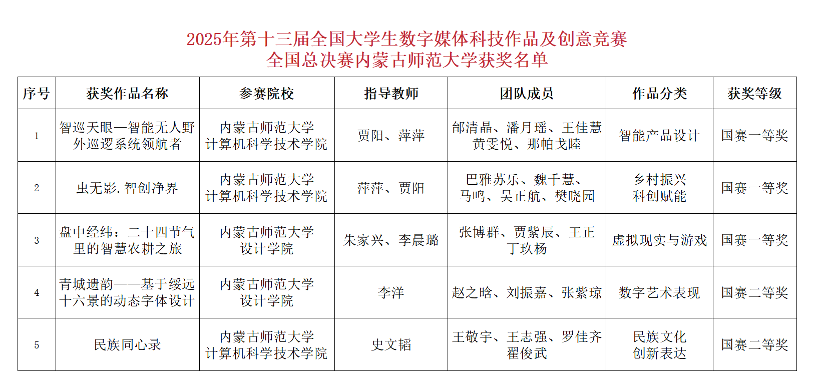 本次竞赛竞争激烈,吸引了包括清华大学、北京大学、中国传媒大学等在内的数百所高校、7000余支队伍同台竞技。在我集团教师的悉心指导下,参赛同学积极备赛、勇于创新、团结协作,最终取得全国一等奖2项、二等奖1项的优异成绩,无论在获奖等级还是数量上均实现历史性突破。获奖作品涵盖虚拟现实(VR/AR)、人工智能生成内容(AIGC)等前沿领域,充分体现了我集团学子在数字媒体科技创新方面的敏锐洞察与实践能力。